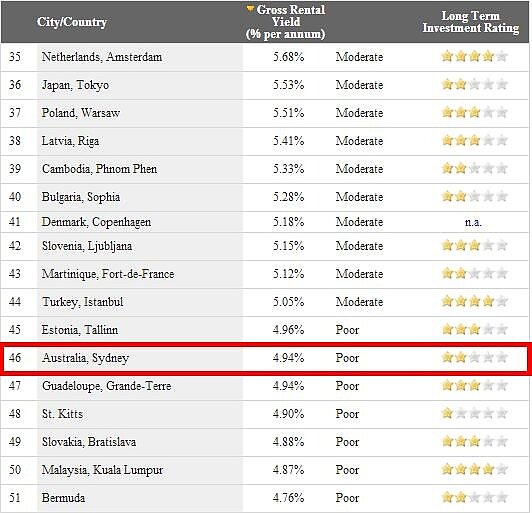 澳洲的雪梨,比紐西蘭遜色許多,投資收益率只有4.94%。