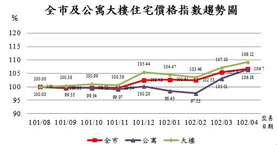 七月底,台北市推出住宅價格月指數,102年4月的指數是比101年8月上升6.7%,也說明著:從實價登錄以來,台北市的房價仍是處於上漲的趨勢。