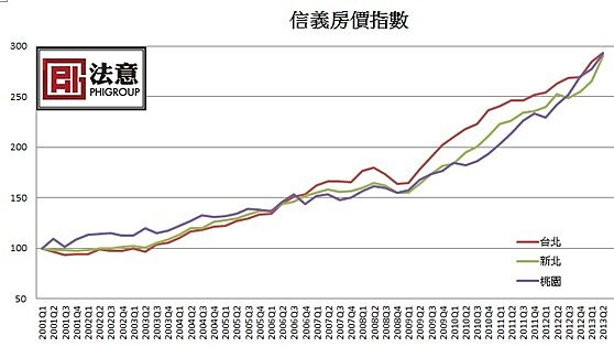 作為成屋市場參考的信義房價指數,有個現象出現,就是桃園、新北市這兩塊外圈的縣市,竟然要追上台北市。