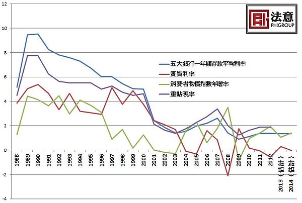 2013年的狀況,實質利率從先前連續兩年的負值,轉向正值,代表目前定存利率不致被通貨膨脹吃掉。不過,到了2014年,實質利率可能會由正轉負,通貨膨脹率將會高過一年期定存。