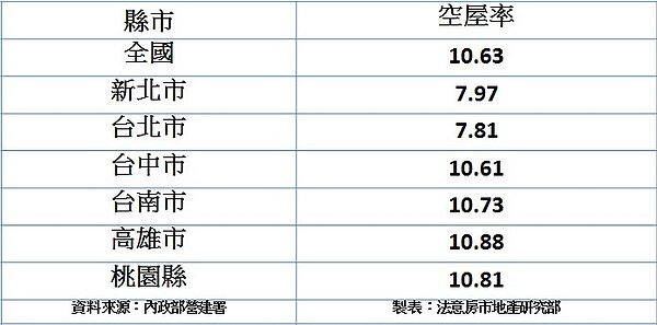 一般來說,空屋率3%~5%,是屬於合理的範圍;台灣全國的空屋率是正常水準的兩倍之多。雙北市、台中、台南、高雄、桃園,空屋率的水準也都是不及格。