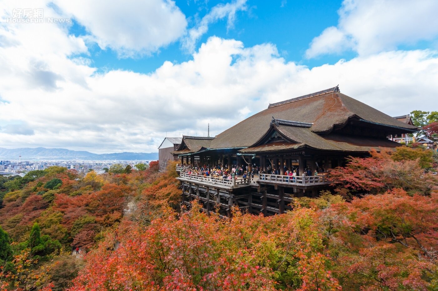 清水寺最經典的角度莫過於此。壯麗的清水寺被火紅的紅葉所圍繞,背景襯托著藍天白雲十分的美麗與莊嚴。