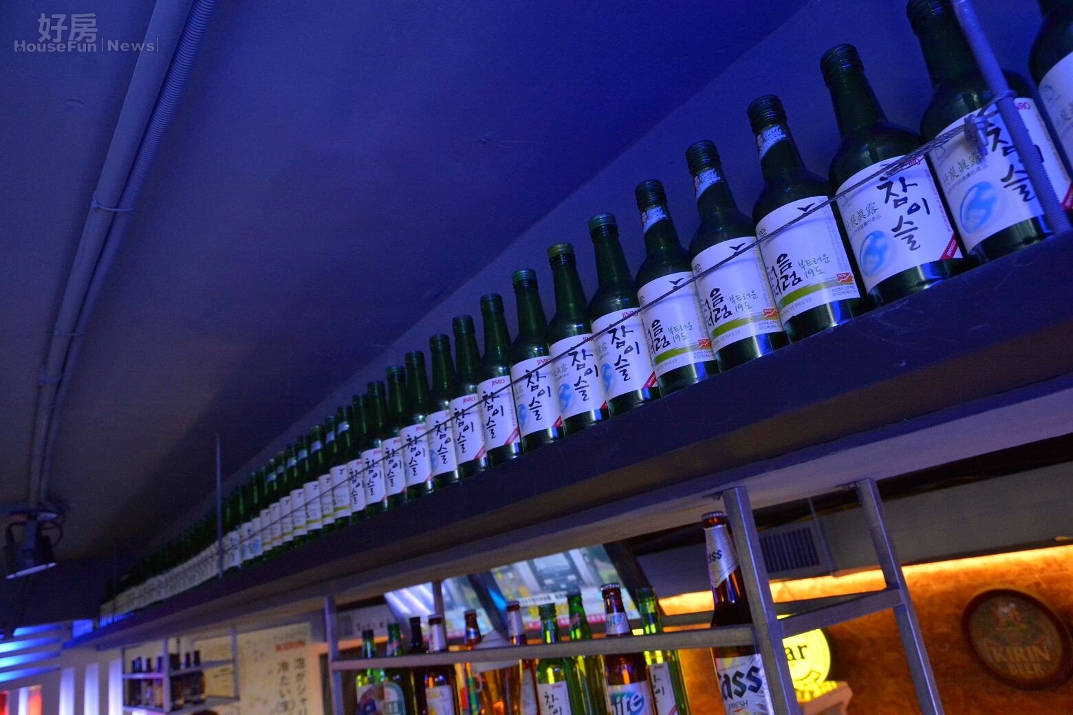 過往掛著炸雞菜單的天花板,改放韓國的真露裝飾。(警語:未滿十八歲請勿飲酒)