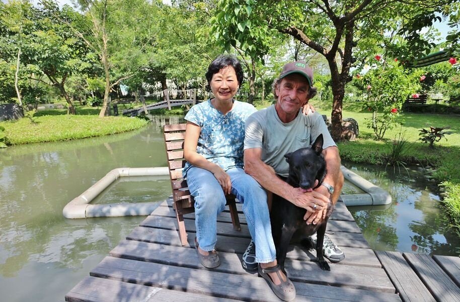 農莊主人羅約翰與太太吳連春力行環保,身旁是他們飼養的小黑狗。