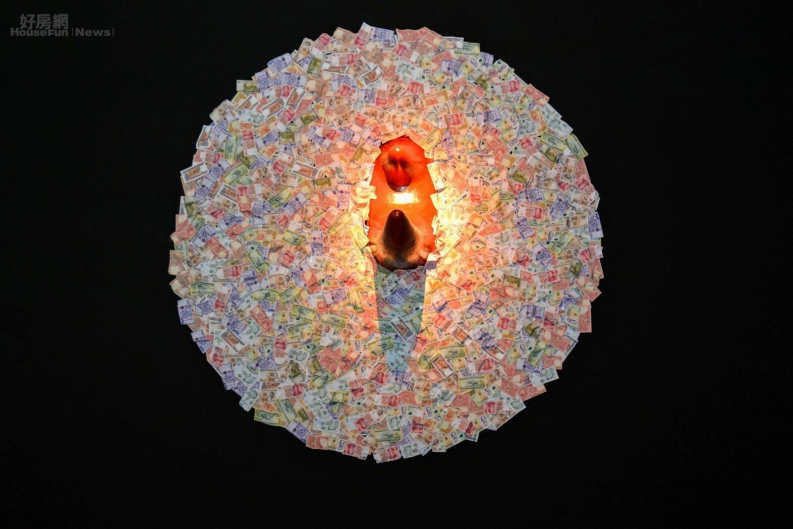 同心圓展現動物DNA的概念,此作品用金錢鋪底,紅色犀牛角立於中間,展現人類為金錢利益殘忍的切除犀牛角。