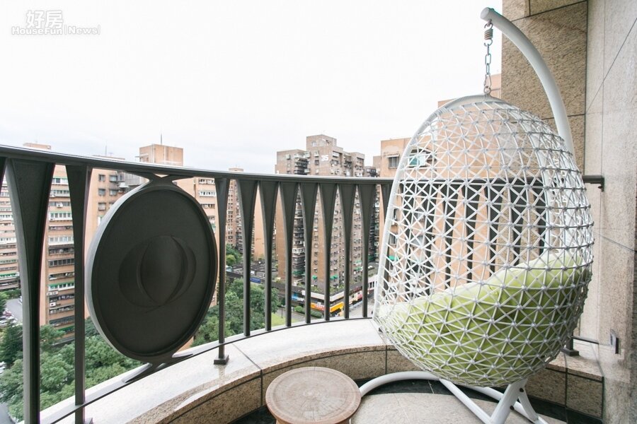 在天氣好的時候,半圓形的陽台是最棒的獨處之地。一本好書、一杯咖啡加上舒適的搖椅,悠閒的一天就此消磨。