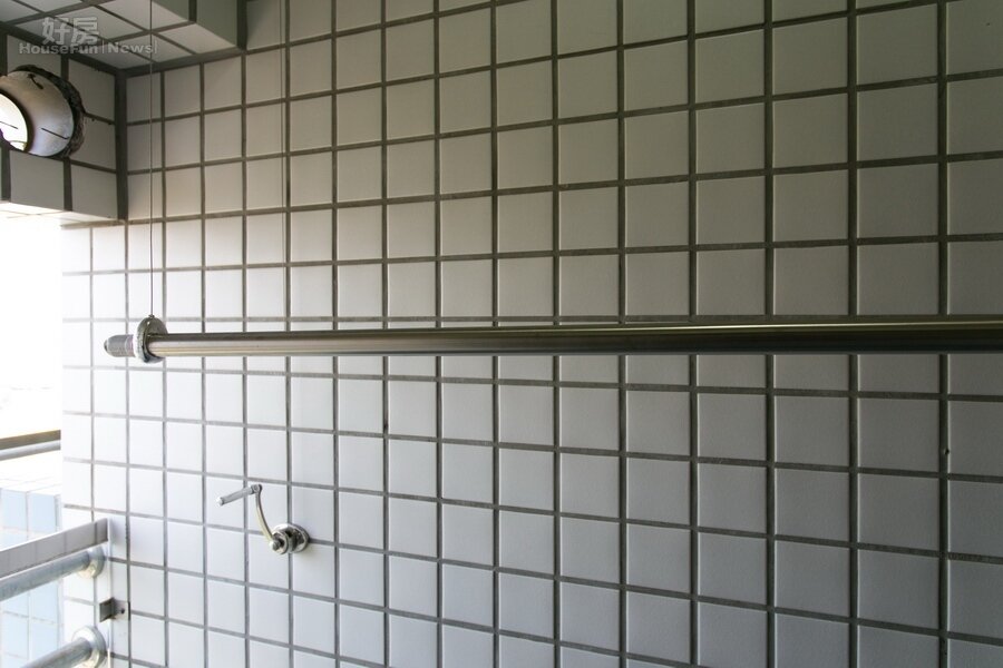 後陽台晒衣間的竿子採鋼索轉輪設計,可依照需求降低或拉高,十分的方便,也省空間。