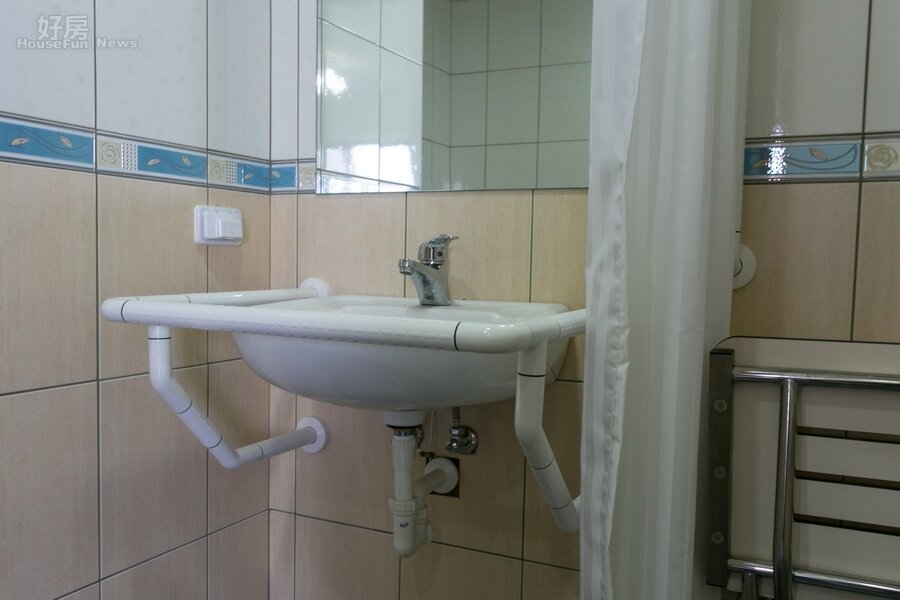 為了讓使用洗手臺更為安全,周邊加裝了可承受重量的輔具。