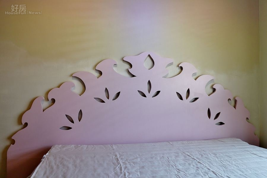 手工床板造型吸睛,加上牆面聚光燈投射在多色彩牆面,顯現不同氣氛。