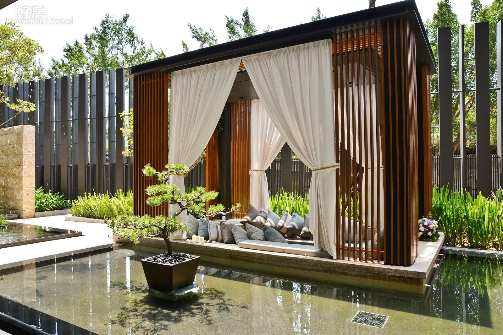 戶外有造景還有希臘風的涼亭,環繞於水中
