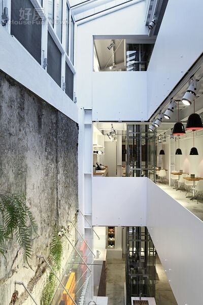 中空的挑高改造方式,讓整個空間更有透視感,為的是讓各樓層的人都欣賞的到整個光影自然的氛圍。