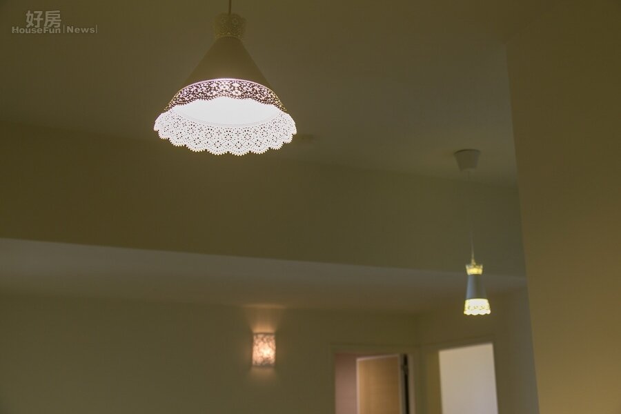客廳中並沒有傳統的單一多顆燈泡主燈,也不是採用現在流行的包覆天花板後裝入嵌燈,而是採用兩個蕾絲吊燈以及壁燈當照明用燈,三組燈飾五千元有找。