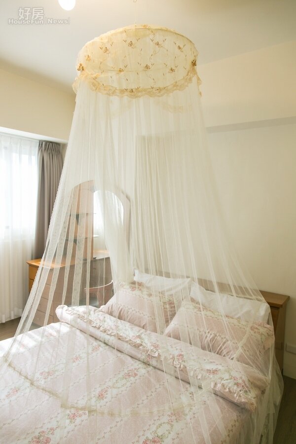 女生最喜歡的就是蕾絲,ROSE也不例外,因此三間臥房到處可看到蕾絲床單、枕頭、床罩等。其中蕾絲帳更是少在一般臥室中看到。