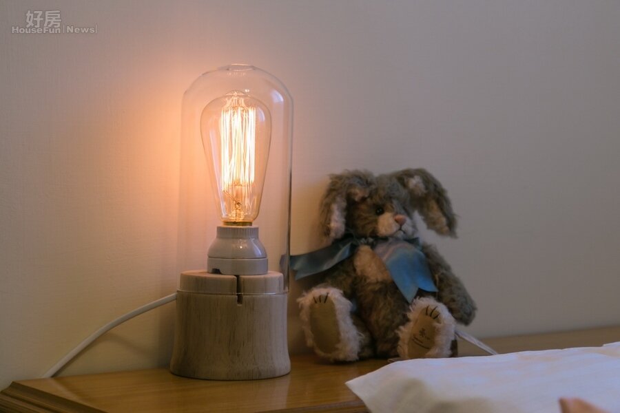 床頭上的愛迪生燈在寒冷的夜晚點亮,房間內立即充滿溫暖感覺,十分的療癒。