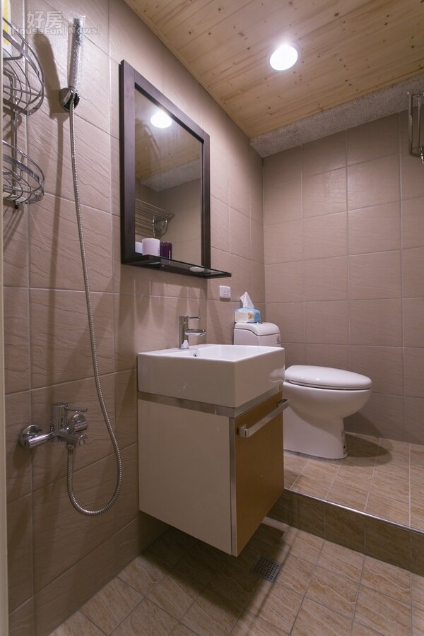 兩間浴室也重新翻修拉皮,拆除原有浴缸改成乾濕分離的衛浴設備,只花了八萬元。另為了安全,全屋水電管路全數重拉,花費十五萬元。