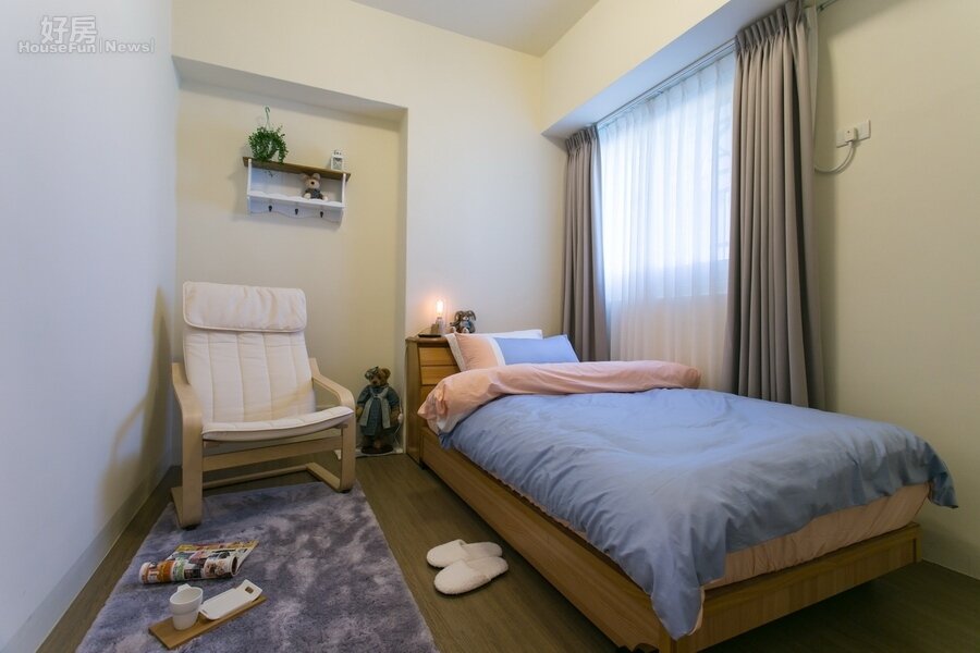 另一間臥室面積不大,放下一單人床就顯得侷促。不過擺上一張單人椅、鋪上一張小地毯,立即成為可獨處一整天也不會膩的私人空間。