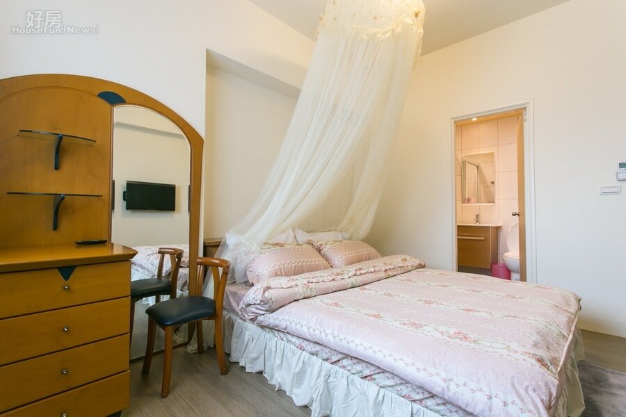 床組雖然沒有買新的,但是利用簡單的蕾絲床單與枕頭套,加上蕾絲帳,整體房間感覺立即升級,彷彿童話中公主所睡的床。