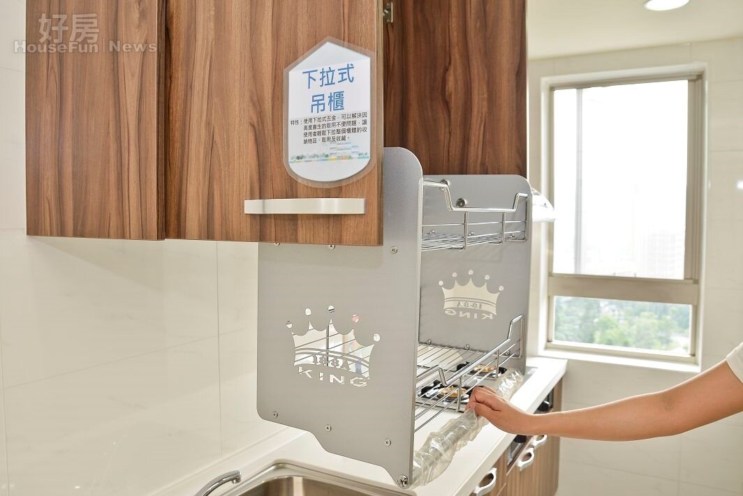 興隆公營宅下拉式吊櫃,除了便於拿取,倘若直接放手,櫃子也會慢慢自動回到原位。