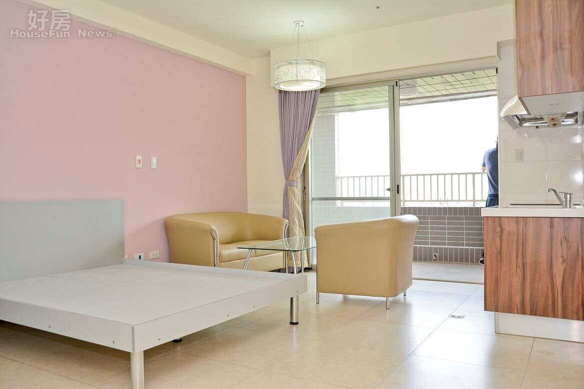 最小坪數規格的套房,但仍有廚房、小小的座椅,其實若是單身或兩人小世界,這樣的格局也很不錯,享受落地窗與房間相融的氛圍。