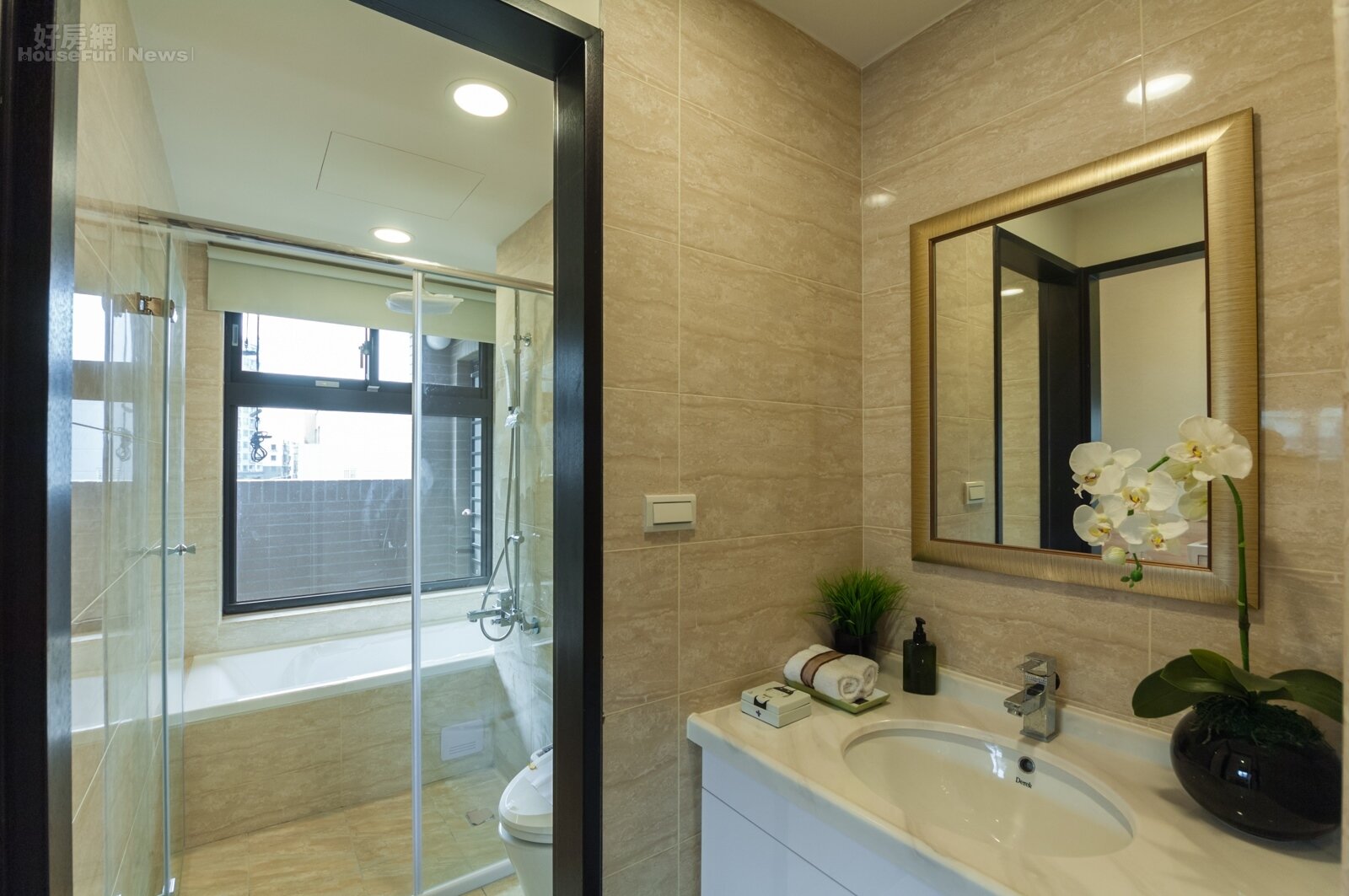 共用衛浴的另一個角度。洗手台用的是Dreak產品,檯面部分則是強化塑膠。