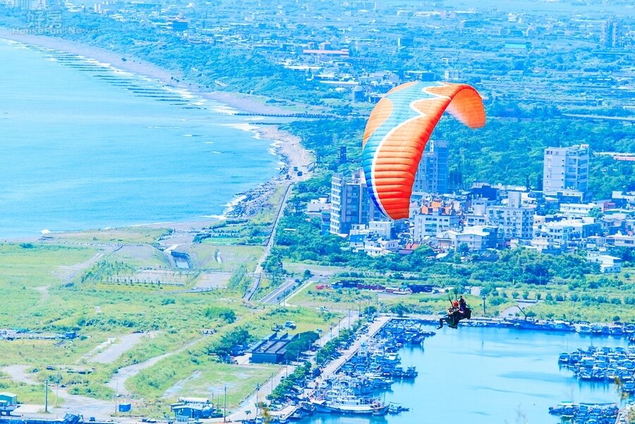 飛行於天空中,可以俯瞰台灣之美。遠方為宜蘭頭城鎮。