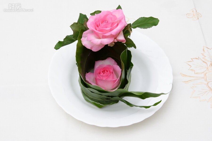 第二朵玫瑰花可以剪短一點,放入山蘇卷中央,這樣可讓玫瑰花有著高低層次感。