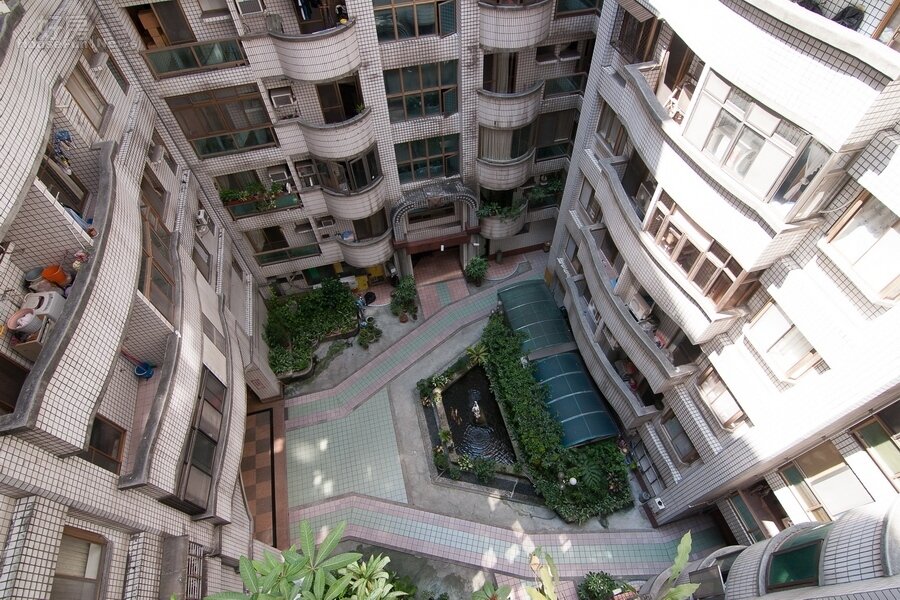社區為口字型設計,也就是所有屋戶包圍著中庭。雖然僅正中午時採光才會很好,但是三十坪的屋內面積、十五年的屋齡以及五百萬的房價,實在是很難再挑剔。