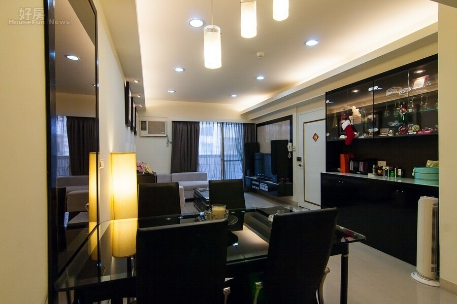 飯廳雖然與客廳連接在一起,不過為了進行區分,飯桌上裝設了三燈一組的燈具。
