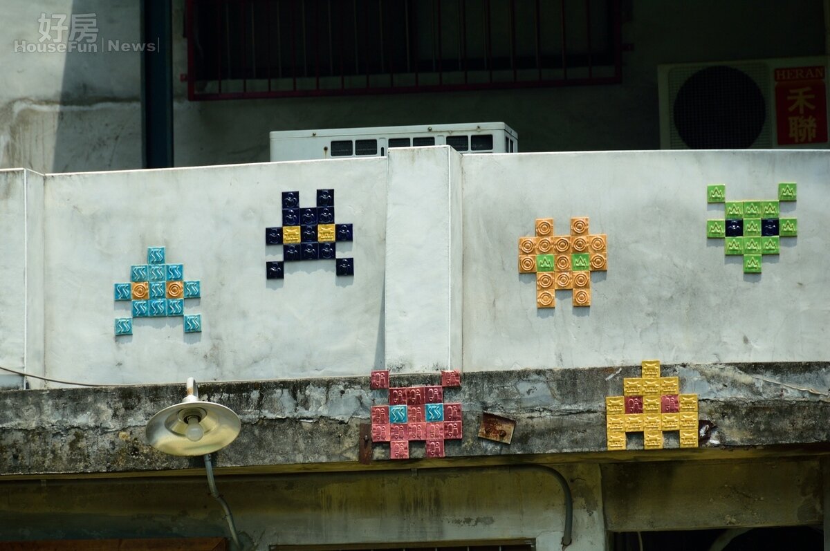 抬頭一看,二樓圍牆上所設計的裝置藝術,就是八位元電玩時期最風彌大眾的「小蜜蜂」電動玩具中的小蜜蜂。
