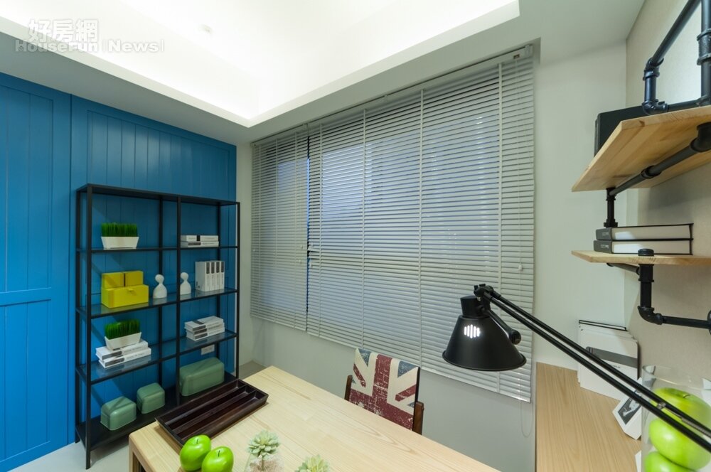 以黑色烤漆金屬水管穿越書桌左側壁面上的承板,也十分具有特色。其中木板溫潤的特性與金屬水管冷冽的感受相交融,營造出既衝突又和諧的氛圍。