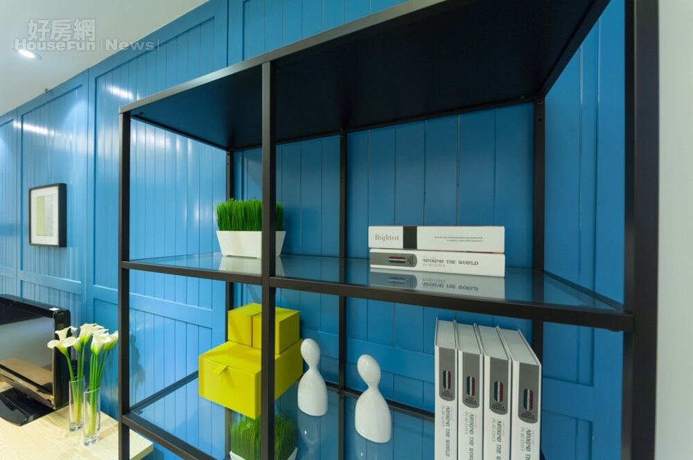 既然是倉庫門造型的壁面,前方放置金屬層架也就順理成章。