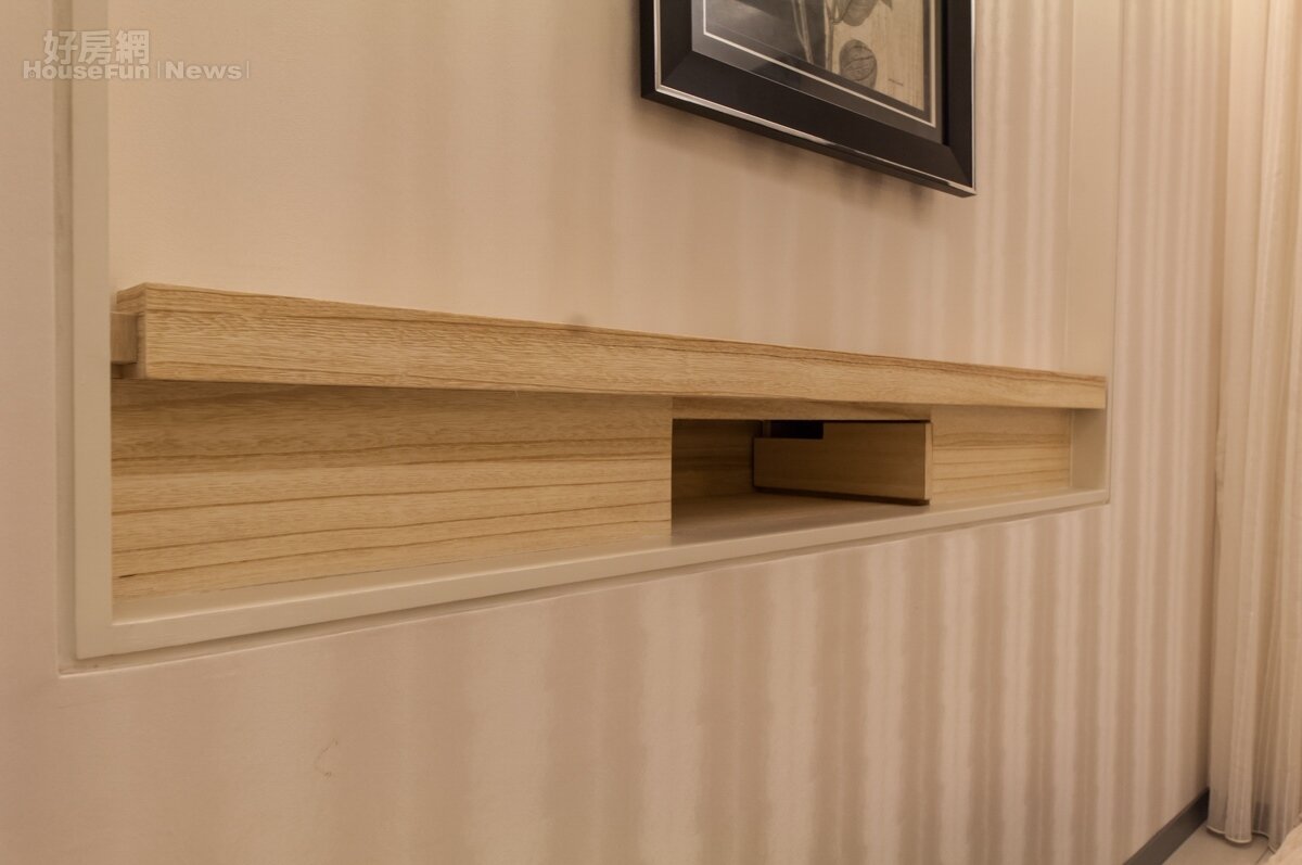 躺在床上看電視是最舒服的享受,因此設計師在主臥設計了一組電視牆,並可收納藍光DVD等播放設備。