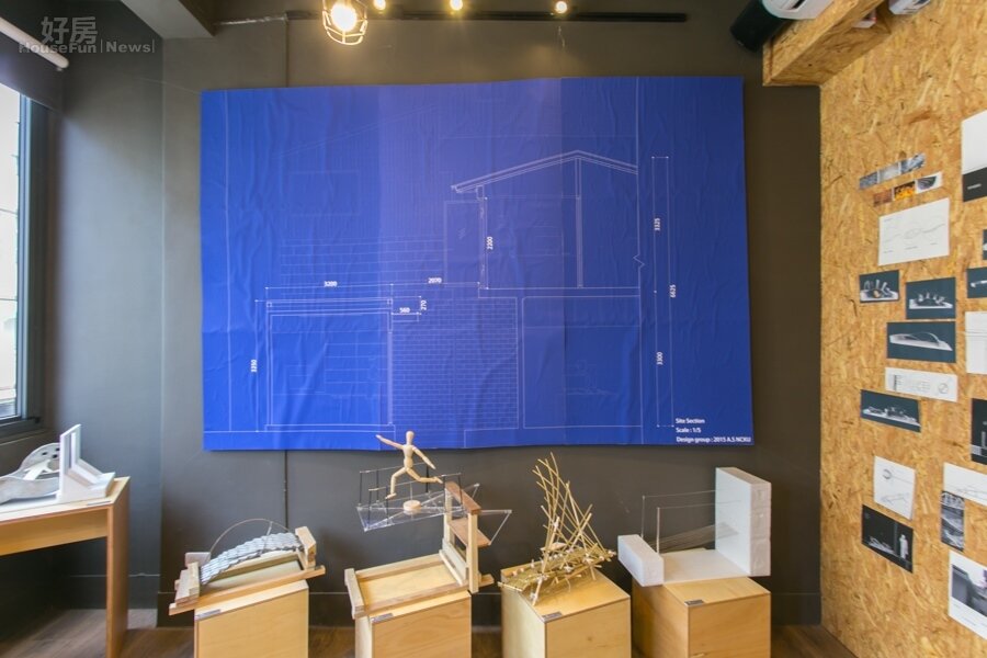 除了一樓展演空間外,二樓一半作為設計團隊的工作室,另一半也當成展演空間使用。牆壁上大張的藍圖就是無有為書店的設計藍圖。
