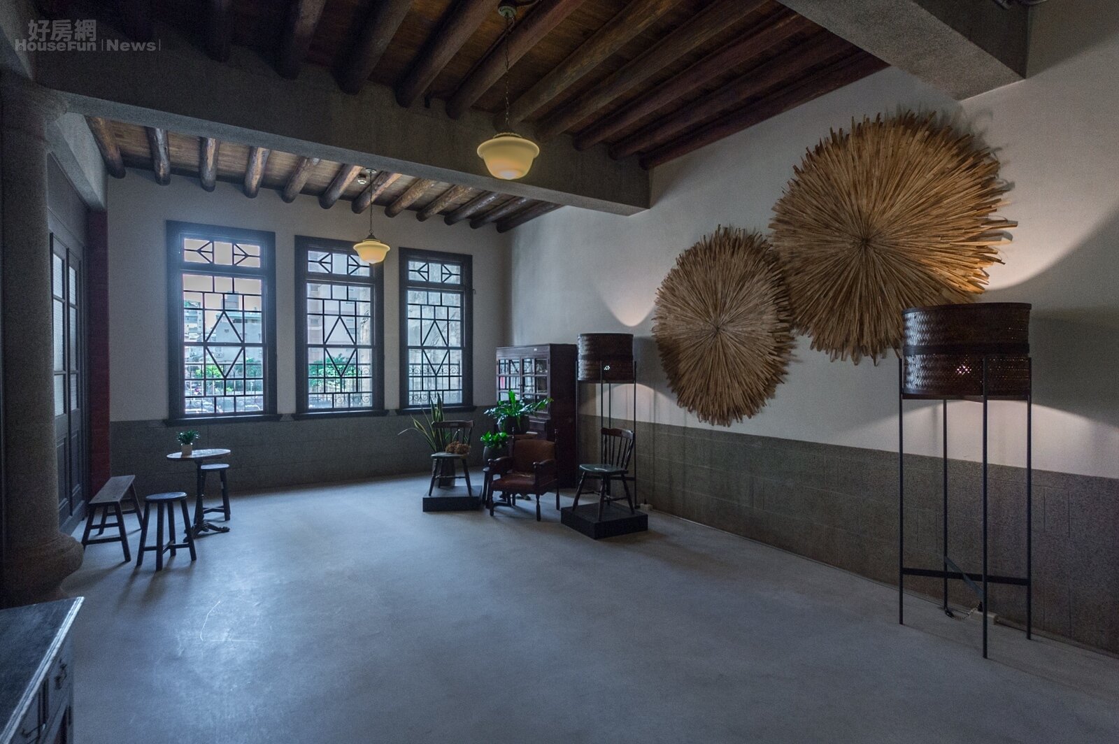 文青一小時—紫色大稻埕,古厝品茶香(下) 猜猜看牆壁上兩個大圓形的壁飾是什麼材質?原本以為是薄木片所組成,靠近一看才發現跟傳統斗笠、粽子一樣的簑葉組合而成。原本裝茶葉的竹籠裝上燈泡後,成為十分具有特色的照明燈具。 601 上一張 下一張