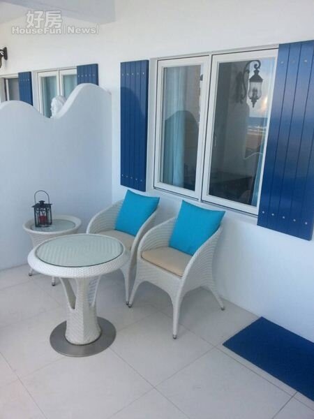 每間房間都有大露台,桌椅也是藍白色系。