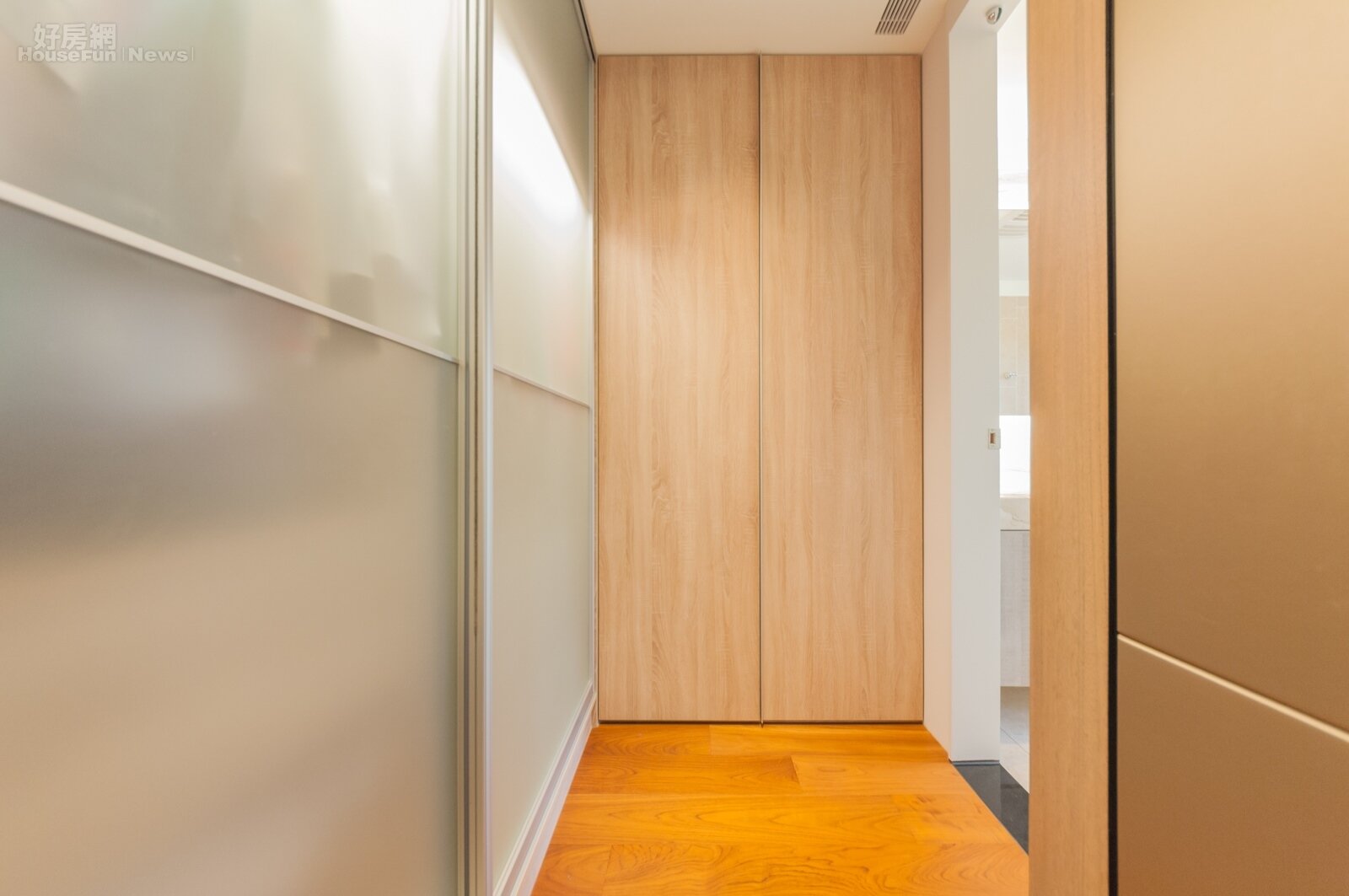 隱藏在主臥室與浴室之間的走道,變成屋主的衣服收納與更衣間。