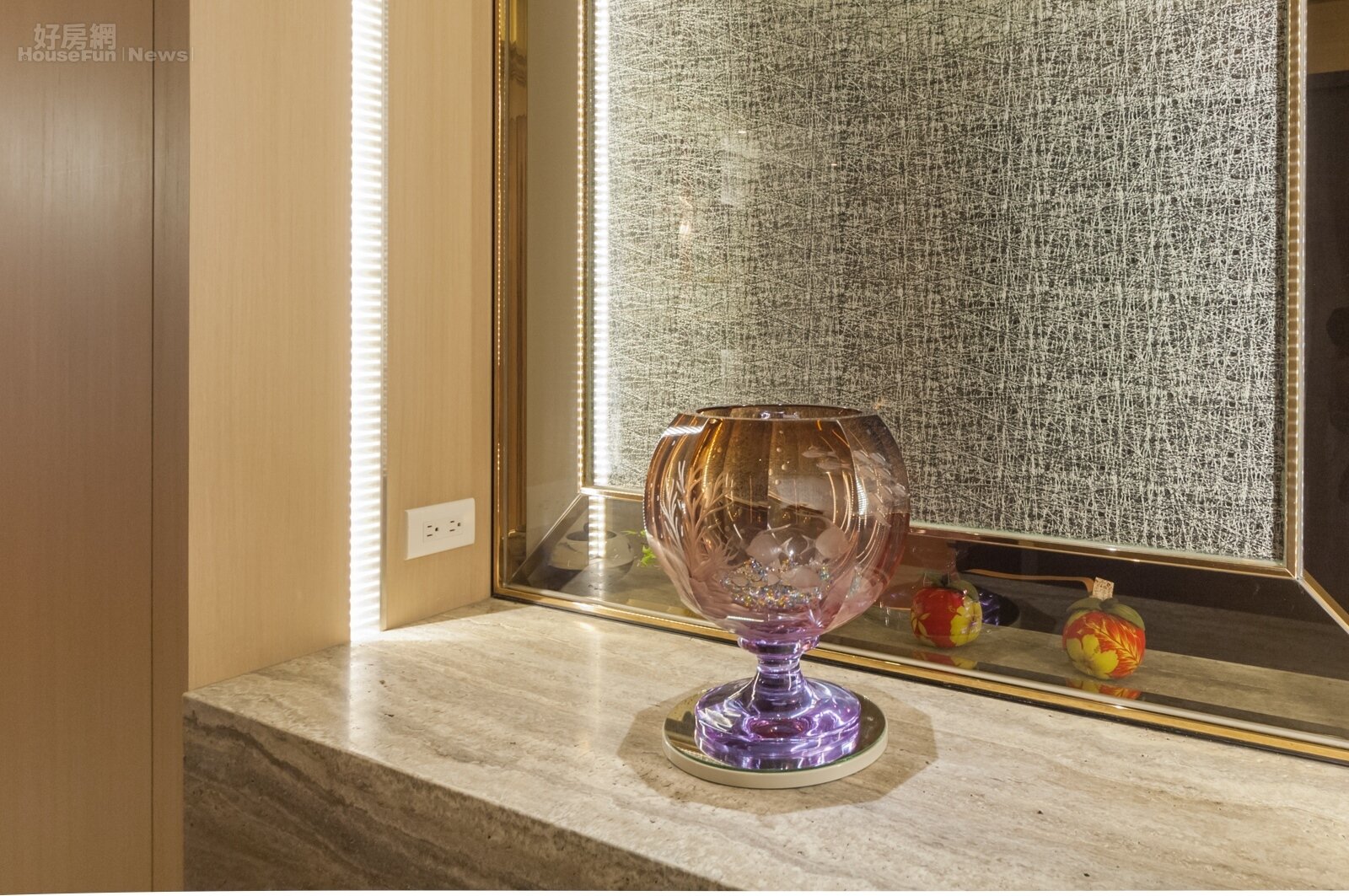 走廊上讓人無法忽視的就是大型水晶杯具有聚寶盆概念的裝飾。