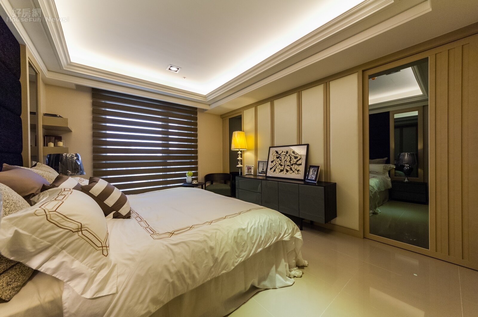 就風水角度而言,床對著鏡子並不是很好的設計,因此在床尾進入主臥衛浴的大型茶鏡,建議可改成霧面的設計,一來可增加採光,二來可避免不優的風水設計。
