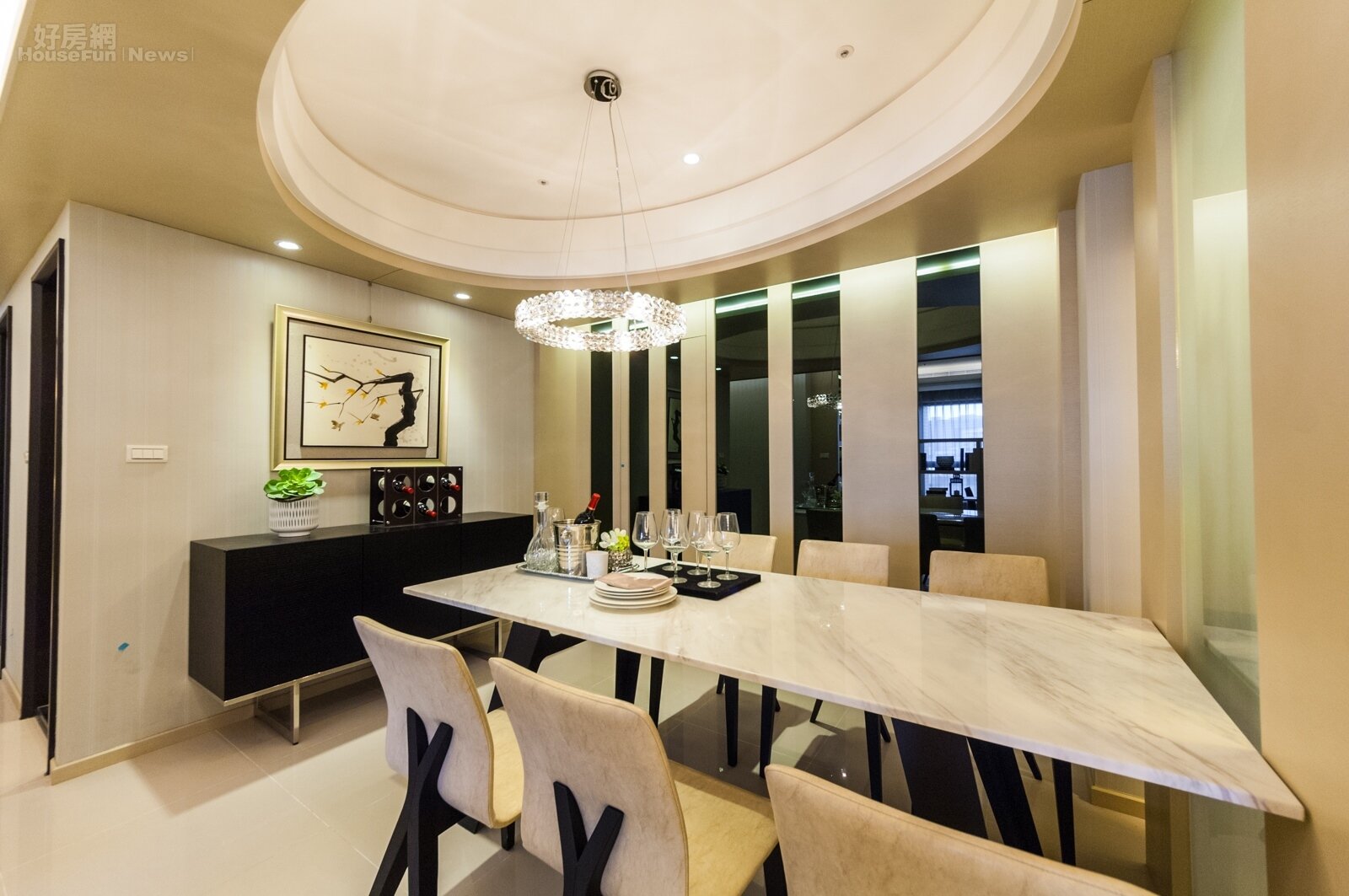 三房的配置最多可讓三代同堂,因此餐廳的空間也就無法省下太多。設計師採用多片茶鏡貼牆,增加整體的質感與寬闊感,廚房部分則是隱藏式設計。