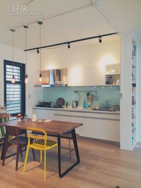 廚房以實木餐桌混搭不同的椅子,搭配垂吊的愛迪生燈泡很有特色。