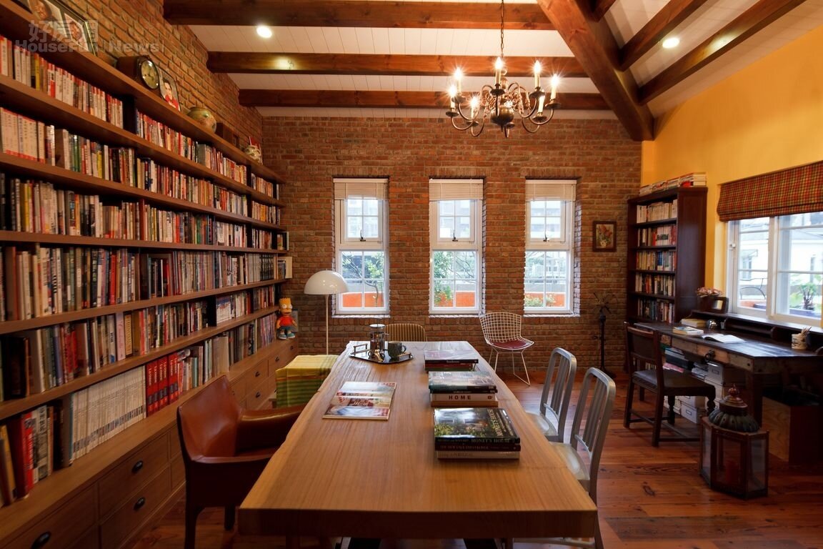 閣樓工作室採光良好,紅磚堆砌而成的主牆面,搭配開放式木頭書櫃與木頭長桌,同樣洋溢舒服的鄉村風情。
