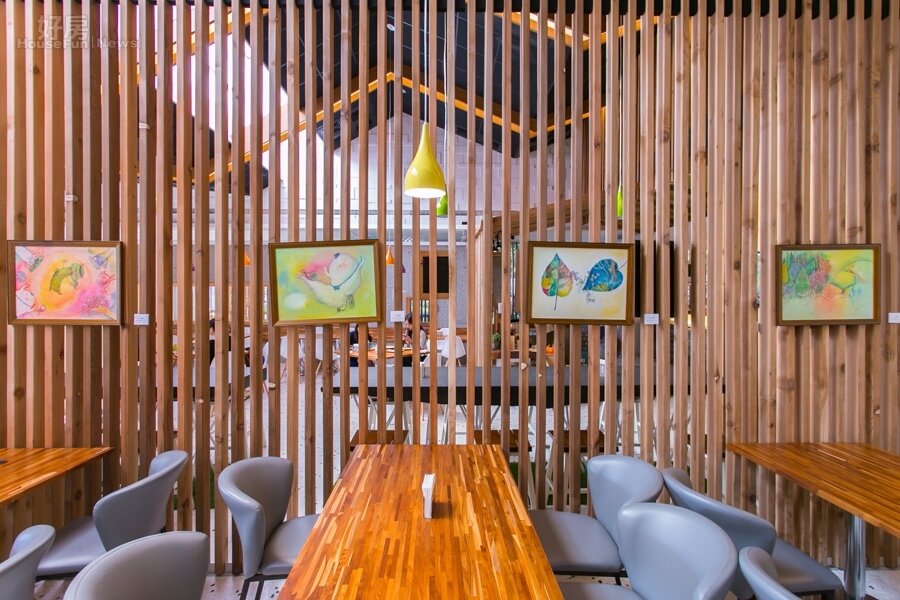 為了讓用餐者已最為放鬆的心情享受美食,室內裝潢部分大量採用原木,並用木條作為兩個餐廳區的間隔。視線上看似受到阻礙,卻又有著關聯的感覺。