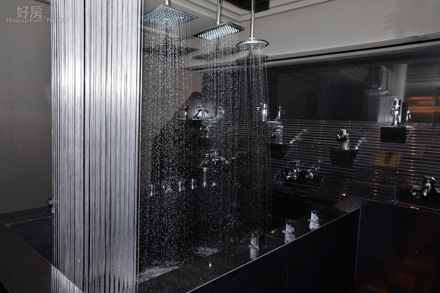 現場有各式蓮蓬頭陳列同時噴水,可看到各種不同的水流狀況