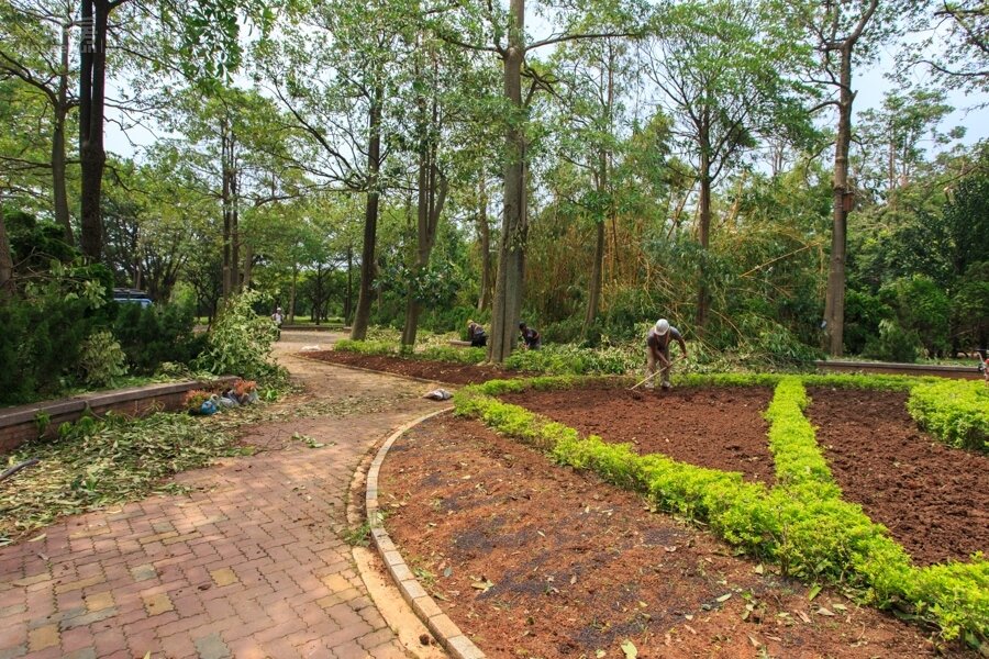 園藝工人正忙著挖除被颱風肆虐破敗的園藝造景,準備種上新的花草以美化公園。只是耕植容易復舊卻很困難。