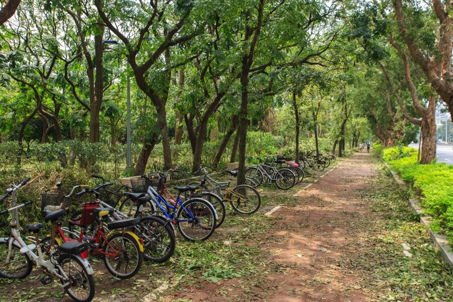 原本是自行車跟行人悠遊行走的道路,在颱風過後殘枝落葉滿地。