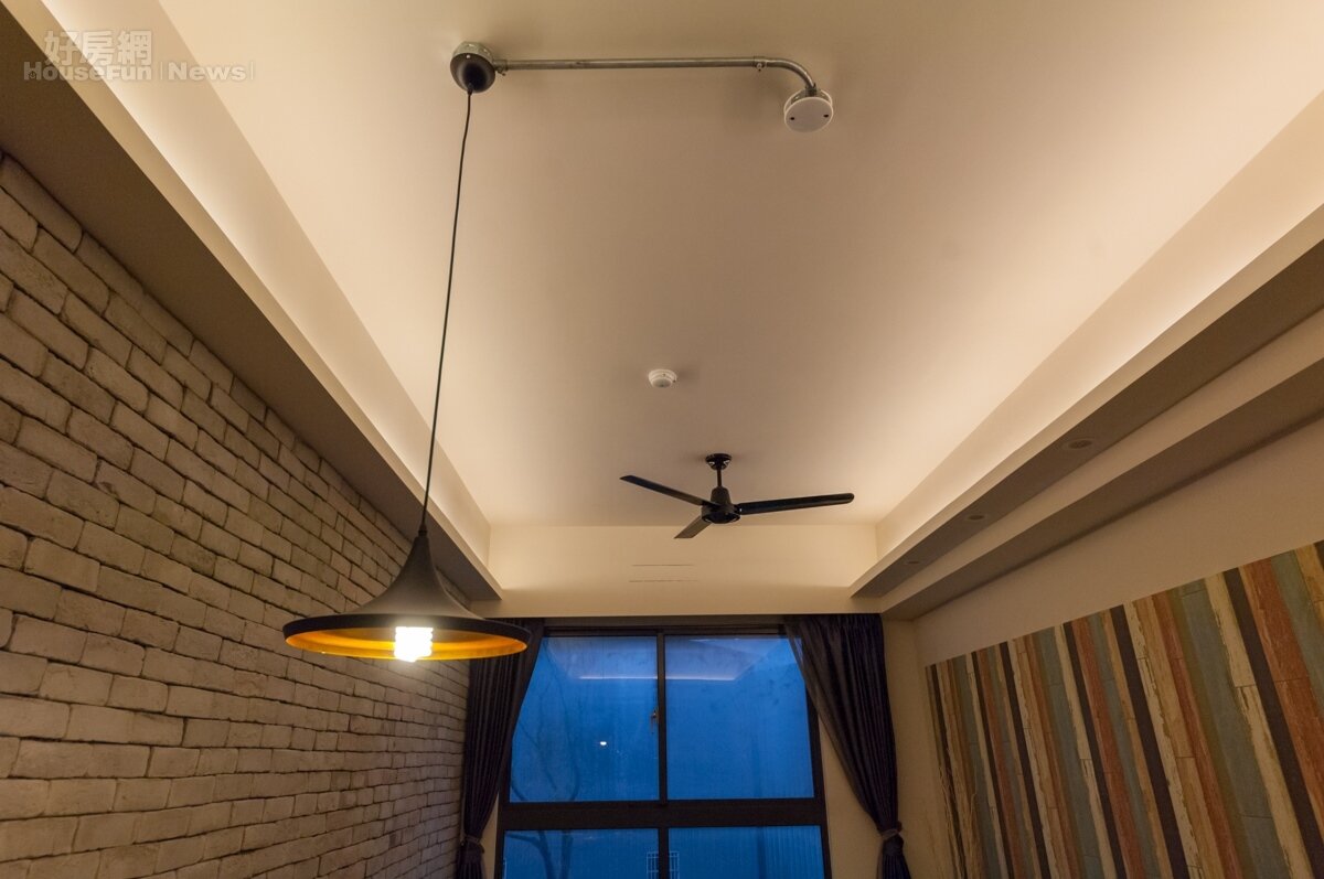 客廳除了間照外,僅有一盞吊掛式主燈。設計師所選擇的主燈外型十分的傳統,以呼應主燈管線外露以及後方三葉吊扇所形成的工業風氣氛。