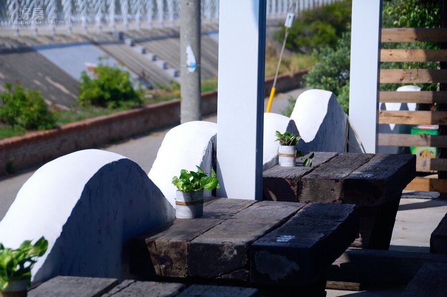 沒搶到車廂內位子也沒關係,車廂外的座位區所有桌椅都是由廢棄的枕木所打造的,十分有意思。