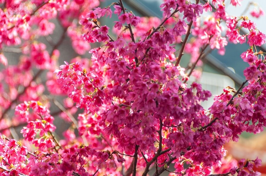 烏來立體停車場旁的櫻花正在怒放,迎接旅客的到來。