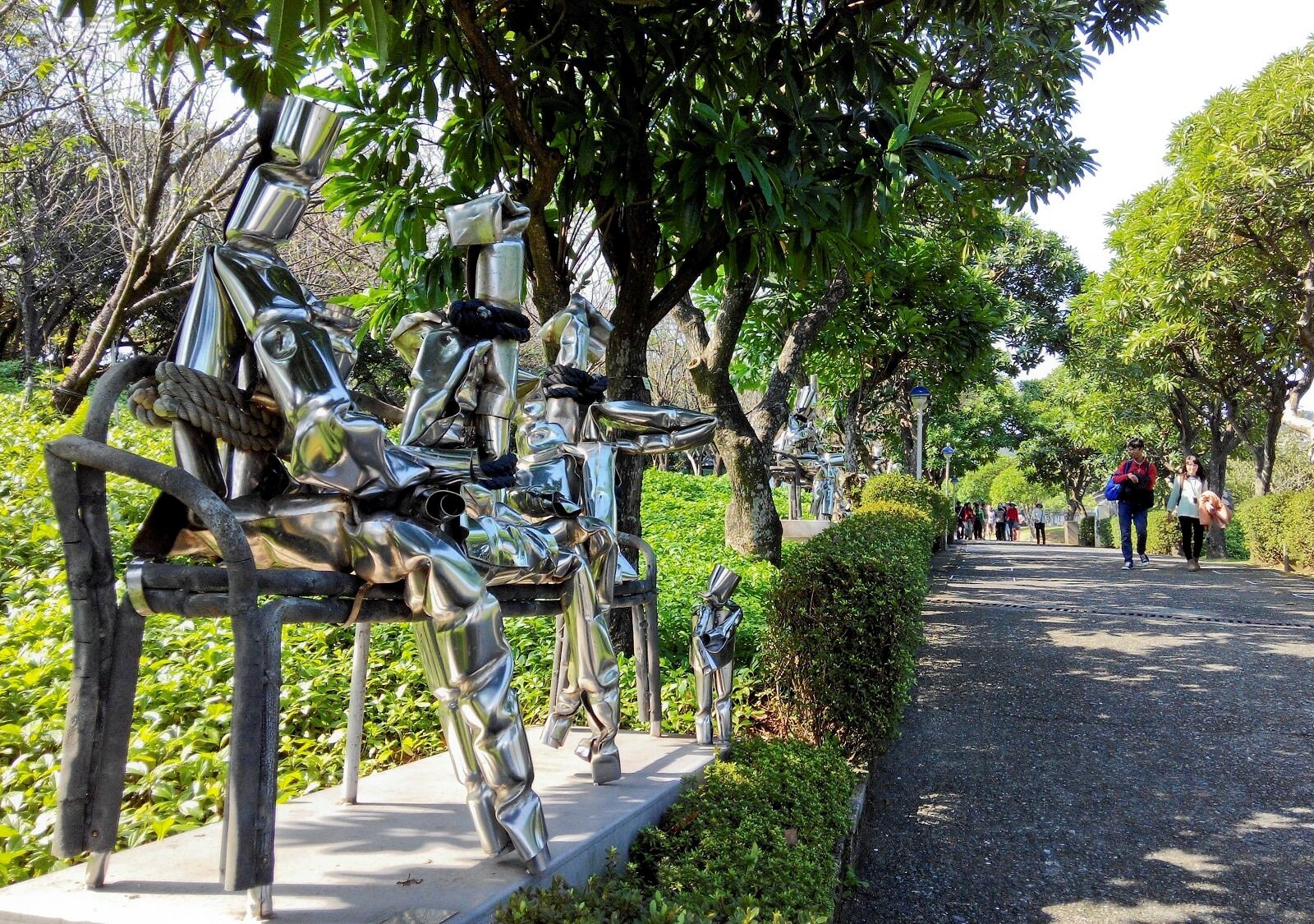 銅雕作品放滿了座椅上,每個作品的動作體態都不同,細細品嘗會發現自己似乎就身在其中。