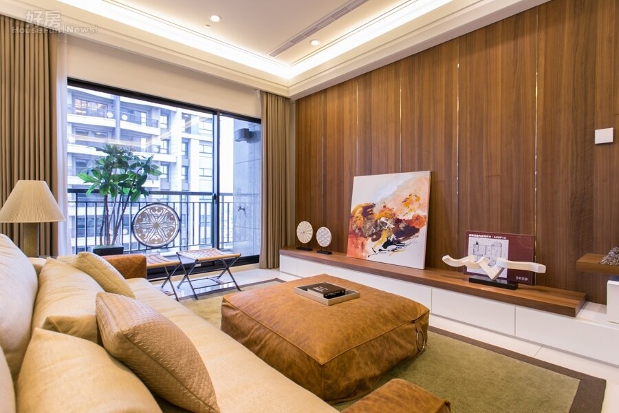 木頭的牆壁以及溫潤的皮革沙發家飾,再加上落地大型玻璃窗,讓整體空間透露出一股溫暖又明亮的氣息。